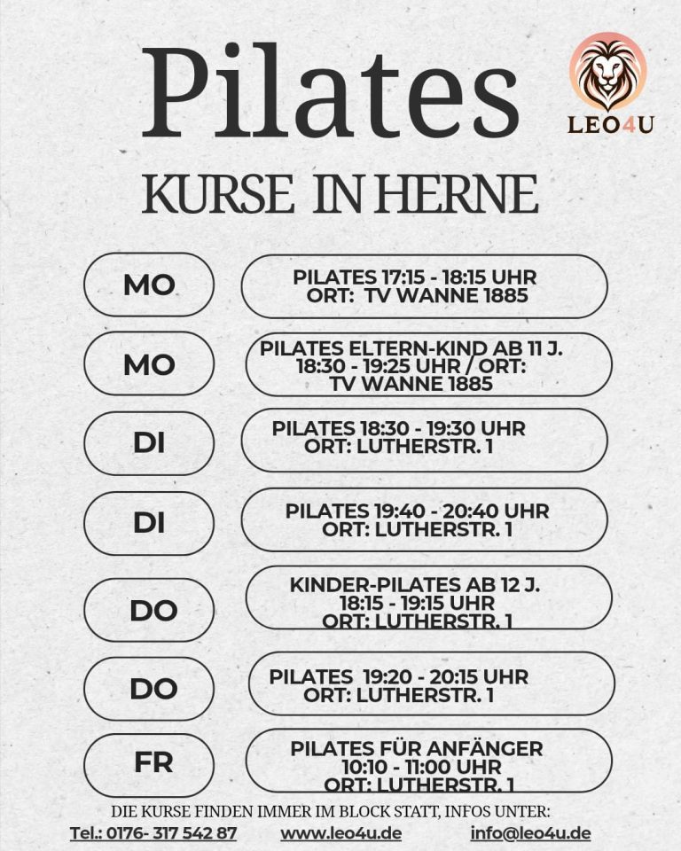 Ob Anfänger, Mittelstufe oder Fortgeschrittene - die Pilates-Kurse von Leo4u sind für jedes Fitnesslevel geeignet. Im Training stehen eine verbesserte Körperhaltung, mehr Flexibilität und ein stabiler Core im Mittelpunkt.